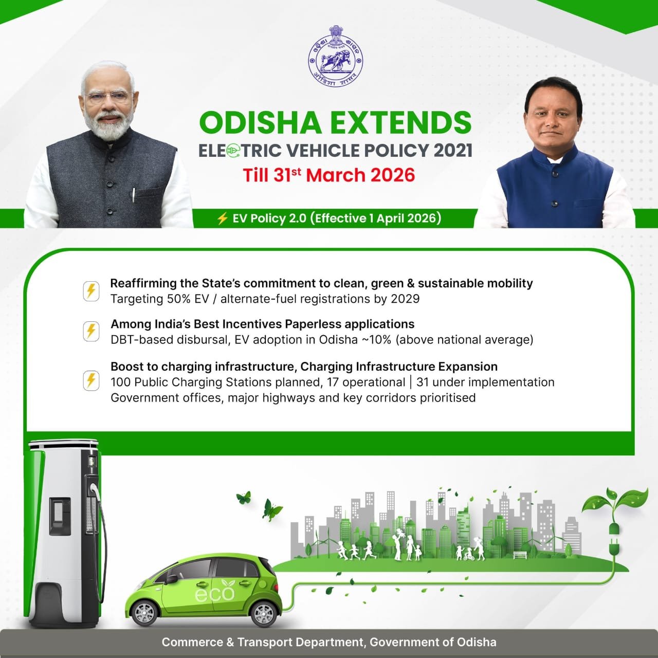 Bhubaneswar: In a strong push towards sustainable cities and future-ready mobility, the Odisha government has extended its Electric Vehicle Policy, 2021 till March 31, 2026, reaffirming its commitment to clean transportation, innovation-led growth, and a greener future.