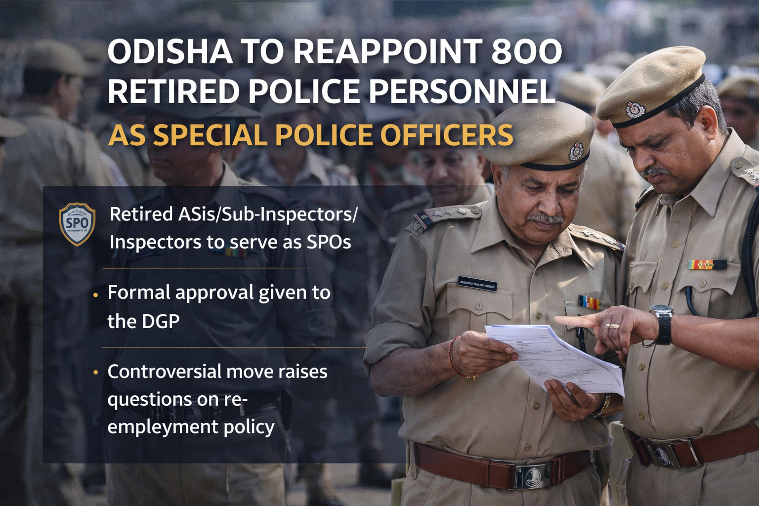 Bhubaneswar: The Odisha government has approved the reappointment of 800 retired police personnel to strengthen policing and internal security across the state. Retired Assistant Sub-Inspectors (ASI), Sub-Inspectors (SI), and Inspectors will be re-engaged and deployed as Special Police Officers (SPOs).