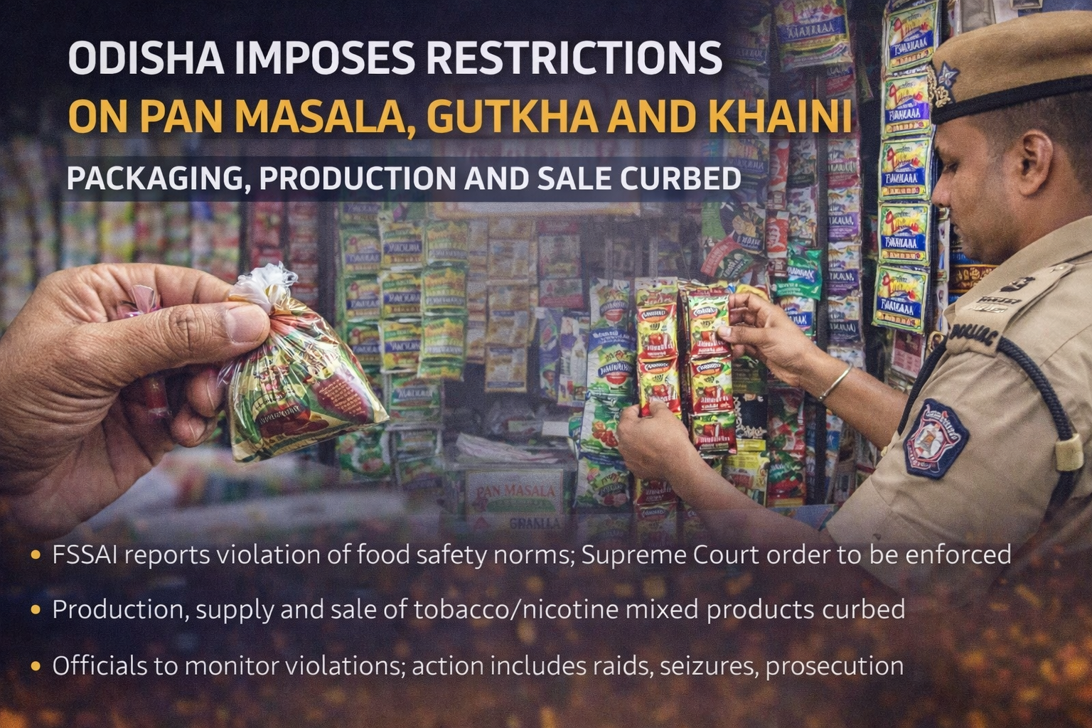Bhubaneswar: The Odisha government has imposed strict restrictions on the manufacture, packaging, supply and sale of pan masala, gutkha and khaini across the state, following guidelines issued by the Food Safety and Standards Authority of India (FSSAI) and in compliance with Supreme Court directions.